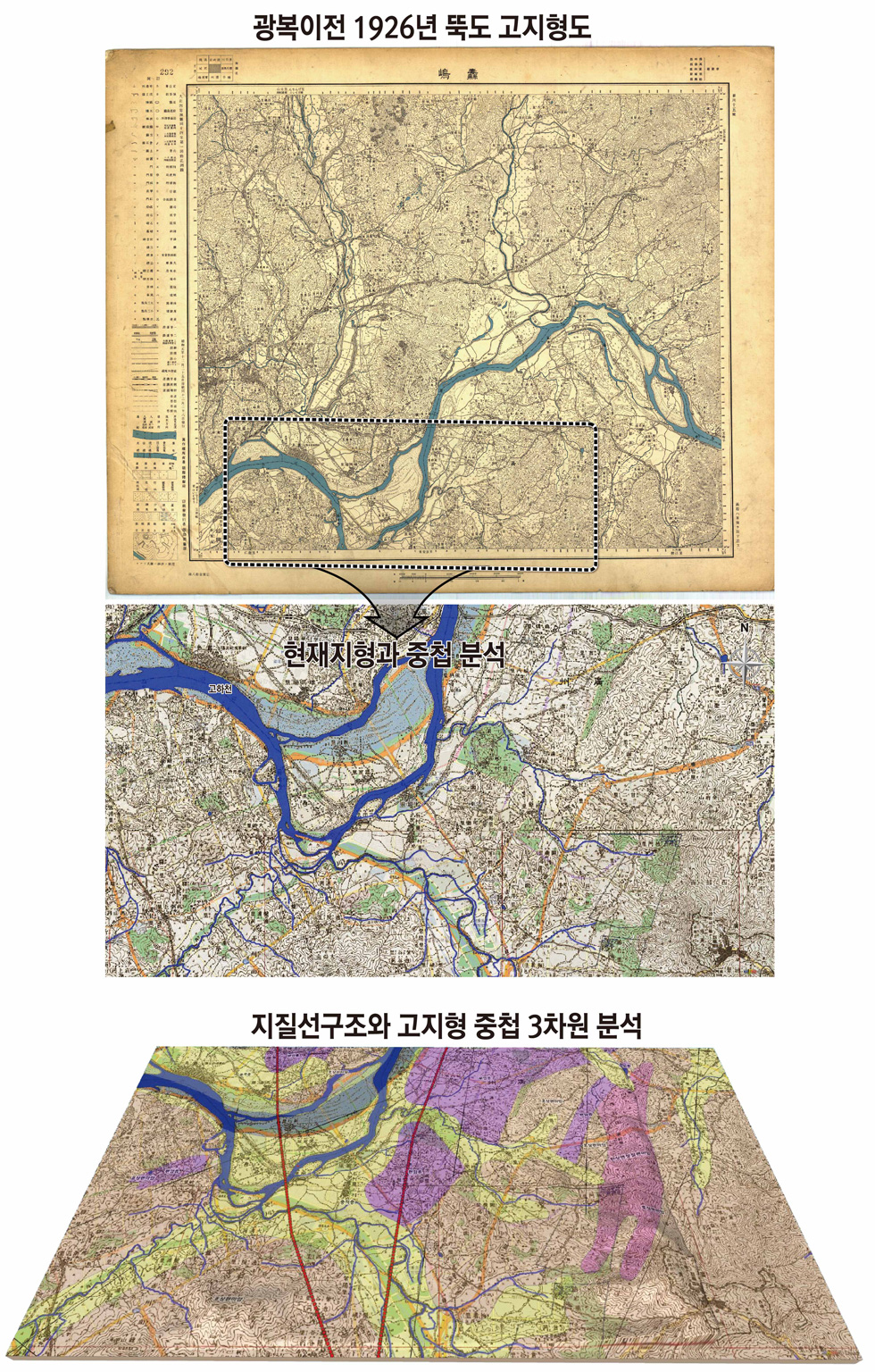 광복이전 고지형도의 좌표체계는 경위도 좌표체계이므로 현재의 좌표체계로 보정하는 작업이 제일 중요합니다. 이 작업이 끝나면 GIS에 투영한 다음 지하안전영향평가에서 가장 중요한 항목인 고하천을 디지타이징 합니다. 디지타이징한 결과는 GIS상에서 현재 지형 또는 지질구조와 연계하여 중첩분석 수행합니다.